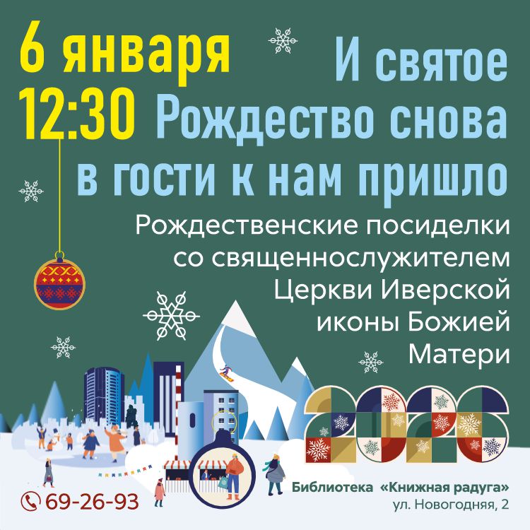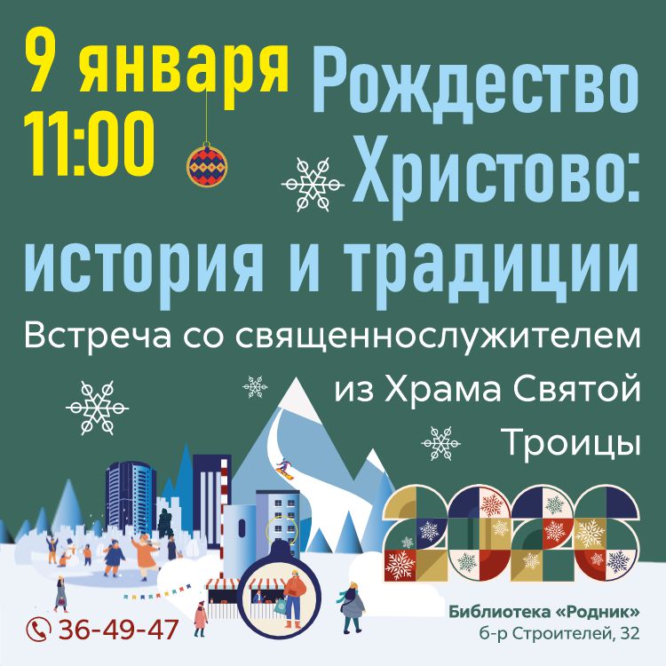 9 января в 11:00 – Библиотека «Родник» (б-р Строителей,  32) организует встречу со священнослужителем Михаилом из Храма Святой Троицы. Беседа будет посвящена истории и смыслу Рождества Христова, его отражению в культуре и традициях, а также тому, как вечные ценности помогают нам в современном мире.