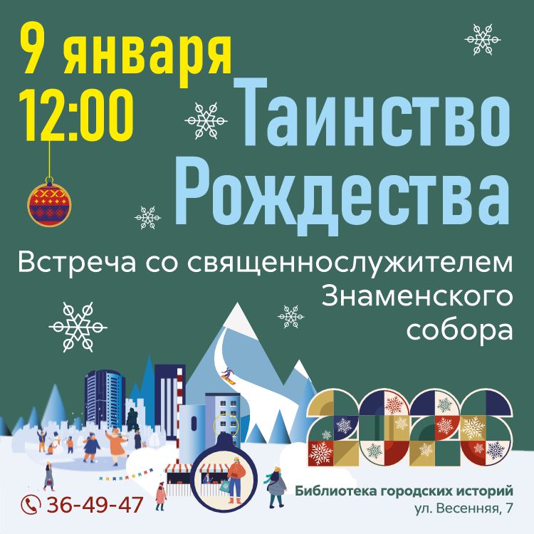 9 января в 12:00 – в Библиотеке городских историй (ул. Весенняя, 7) состоится встреча со священнослужителем на тему «Таинство Рождества. История, заблуждения и традиции». Мероприятие проведет руководитель молодежного отдела Кемеровской епархии, иерей Михаил Пышинский, клирик Знаменского собора.