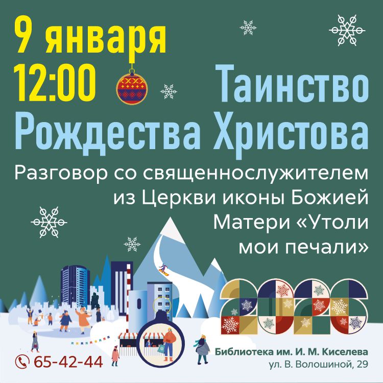 9 января в 12:00 – Библиотека им. И. М. Киселева (ул. В. Волошиной, 29) приглашает на беседу со священнослужителем Отцом Иваном из Церкви иконы Божией Матери «Утоли мои печали». Отец Иван расскажет о таинстве Рождества Христова, библейских историях и ответит на вопросы посетителей.