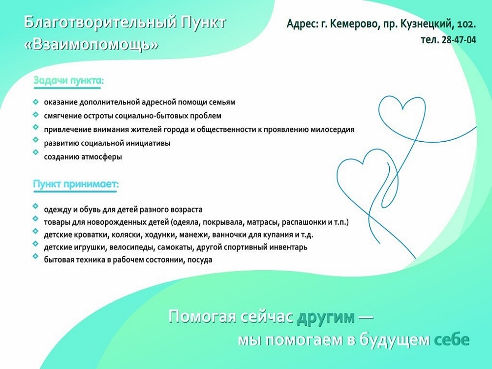Информируем Вас также о работе на территории города Кемерово благотворительного пункта «Взаимопомощь» по приему вещей от населения и предметов первой необходимости для детей, который также располагается на базе МБУ «Центр социальной помощи семье и детям города Кемерово «Семейный центр», по адресу: г. Кемерово, просп. Кузнецкий, 102 (телефон 28-47-04).