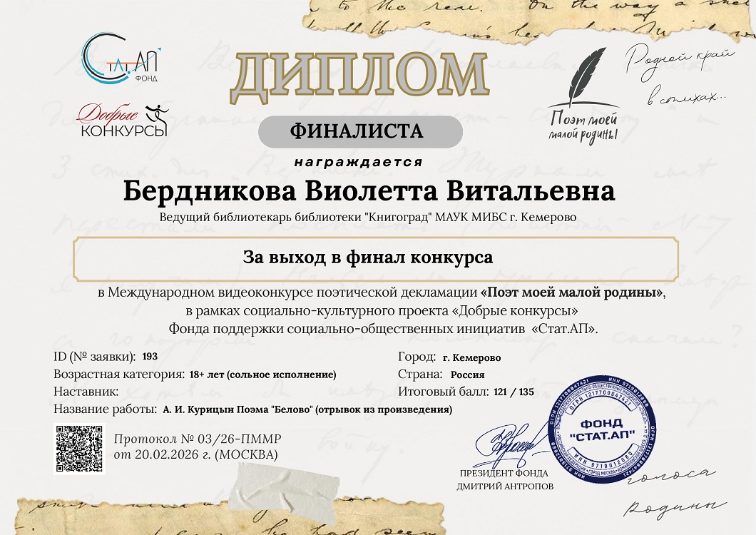 Поздравляем коллегу Виолетту Витальевну Бердникову ведущего библиотекаря библиотеки «Книгоград», с Дипломом финалиста. Для участия в конкурсе Виолетта Витальевна прочитала отрывок из поэмы «Белово» автора А. И. Курицына. Выбор произведения обоснован личными мотивами: «Александр Иванович – не просто поэт, это мой земляк, ветеран шахтёрского труда, член Союза писателей России. Он большую часть жизни прожил в посёлке городского типа Новый Городок, откуда и я родом. В 2023 году я выбрала изучение его творчества в качестве темы для своей дипломной работы. Читая Курицына, я каждый раз возвращаюсь в свой родной городок, к тёплым и дорогим сердцу воспоминаниям». Организатор конкурса: Фонд поддержки социально-общественных инициатив «Стат.АП» совместно с социально-культурным проектом «Добрые конкурсы». Приглашаем посмотреть видеоролик с выступлением по ссылке: https://vk.com/wall-138558365_18462 Мы искренне поздравляем Виолетту Витальевну с заслуженной наградой! Желаем дальнейших успехов, новых ярких идей и вдохновения. Библиотека «Книгоград», тел.: 73-64-74.